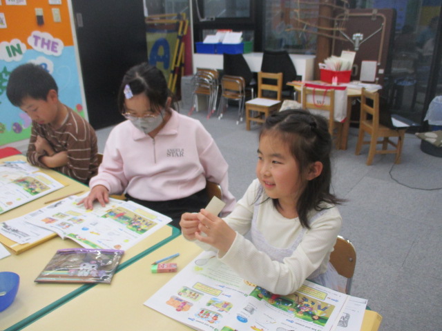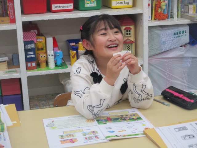 又、テキストに登場する「グローブ」や「バット」「スケートボード」「釣り竿」といった様々なアイテムを利用し、「I have a fishing rod and a bucket. I’m going to go fishing.」といった表現に挑戦しました。絵カードの中から好きなアイテムを選び、自分が持っているものを伝え、それらを使ってこれから行うことを伝えました。