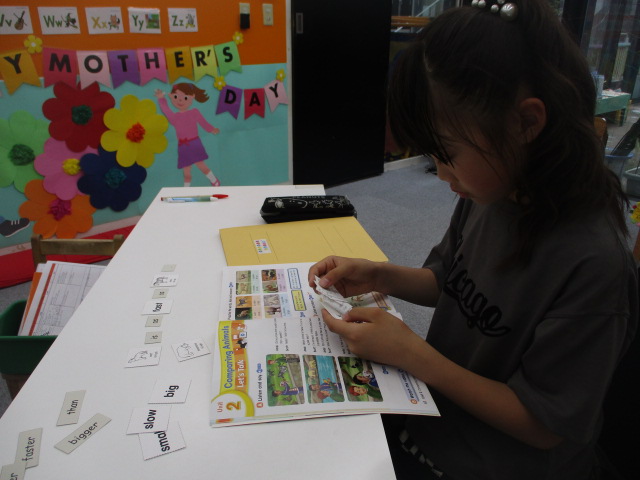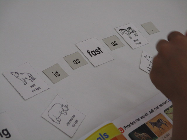 Grade 8 Class この日の「小学生クラス」では、「原級」を学習しました。「A wolf is as fast as a zebra.」のように、2種類の動物の走る速さが同じだということを伝える表現を覚えました。また、速度だけでなく大きさについても同等の動物を表現することにも挑戦しました。