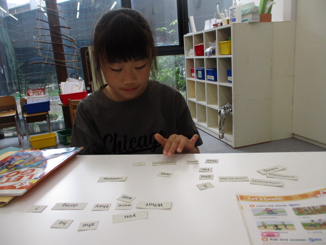 Grade 8 Class この日の「小学生クラス」は、「過去進行形」を学習しました。「What was she doing?」や「What were they doing?」といった質問文と「She was hiking.」「They were running.」といった応答文のつくりを理解し、文章作りに取り組みました。 テキストのイラストに沿ってQ&Aのやりとりを行った後は、「What were you doing yesterday?」といった質問に自分自身のこととして答えていきました。