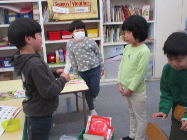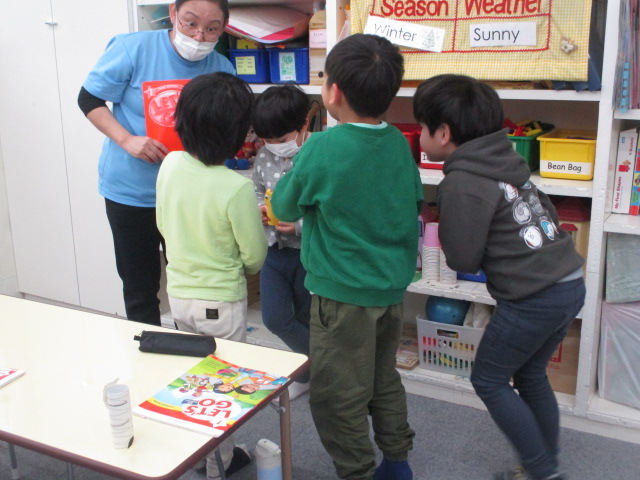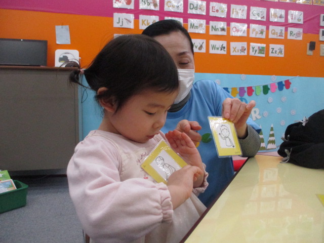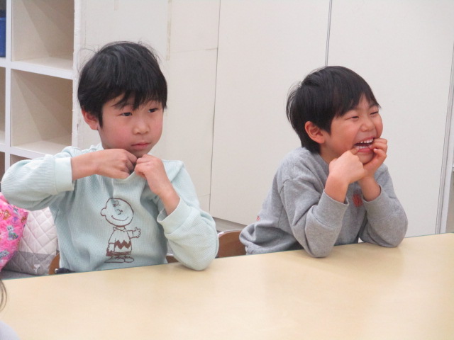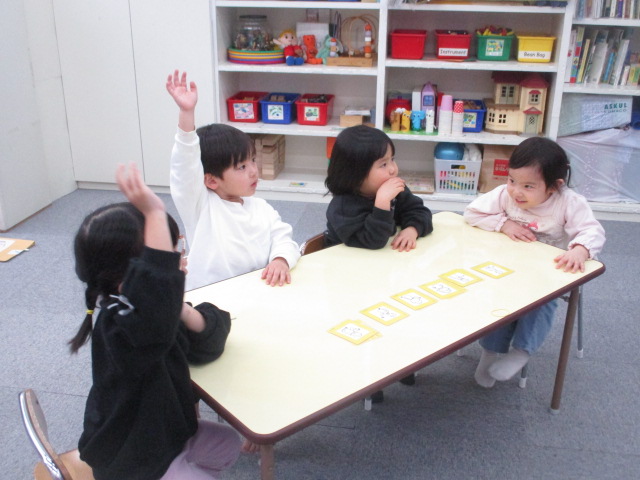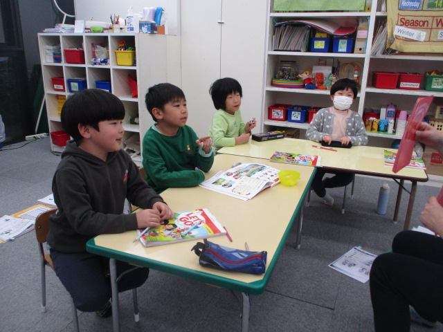 この日の「小学生クラス」は、単数と複数の表現がテーマでした。色々な動物のカードを使い「There is a dog.」「There are dogs.」という文章を練習しました。