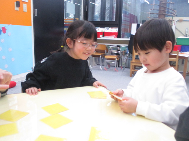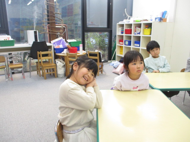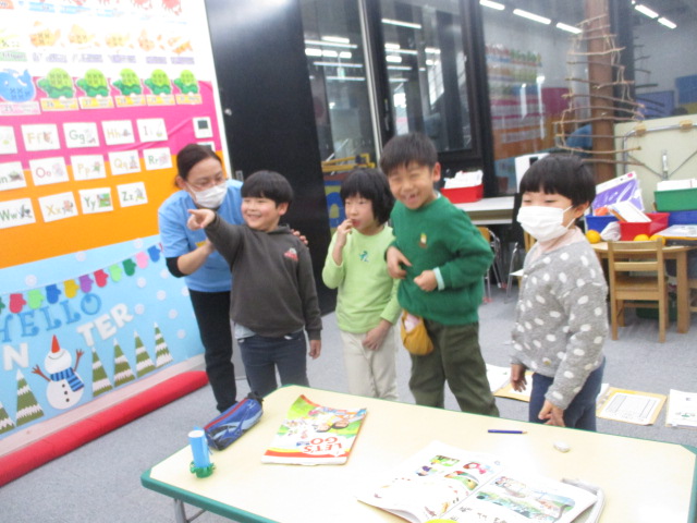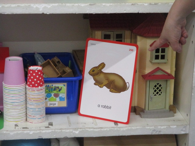 動物が1匹・1頭の場合と、複数いる場合の表現をしっかりと覚え、教室内に置かれた絵カードを見ながら「Look! There is a rabbit!」などと順番に言っていきました。